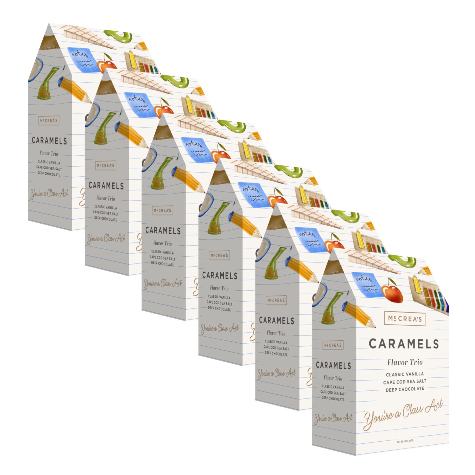Make the gift giving honor roll this year with our Class Act Gable Box. Perfect for teachers, principals, professors, or recent grads, this smart little box earns top marks in appreciation. Inside, they'll discover 15 luxuriously smooth caramels—five each of: Classic Vanilla, Cape Cod Sea Salt, and Deep Chocolate. 15 individually-wrapped pieces of caramel in all.